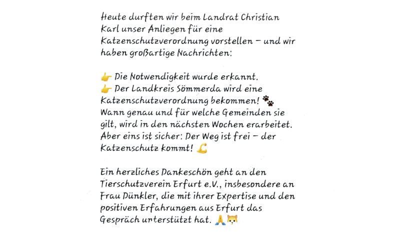 Die Sprecherin des „Bündnis KatzSchV“, Frau Christiane Uri, hatte unsere Vorsitzende um Schützenhilfe für den Erlass einer Katzenschutzverordnung im Raum Sömmerda gebeten und damit um die Teilnahme am Landratsgespräch mit Herrn Christian Karl am 25.08.2025. Ihre Zufriedenheit über die Zusammenkunft drückte sie in einem Dankeschöntext aus: